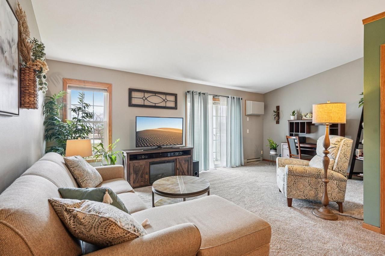 Enjoy easy condo living in desirable Country Garden Association w/prime location near freeway, shopping,dining,parks,& Eisenbahn Trail.This 2BR,2BA upper unit offers 1,348 sq ft w/vaulted ceilings & an open-concept layout filled w/natural light.The spacious living room features patio doors leading to a private covered porch,+ an add'l flex area currently used as an office,ready for your own ideas & style.The eat-in kitchen offers a breakfast bar,ample cabinet/counter space & pantry.Primary suite w/WIC+add'l closet & ensuite w/walk-in shower.2nd BR w/WIC+add'l closet.Private entry,in-unit laundry & 2 car attached GA.New Pella Windows,Patio Door & LVP Flooring '25.Low dues include lawn & snow removal.Pet friendly & rentals allowed(restrictions apply). Meticulously maintained & move in ready!