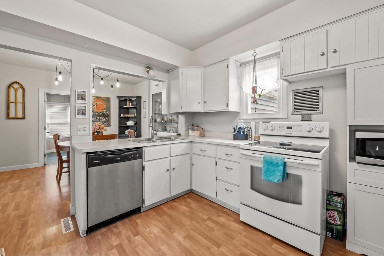 Charming 3BR, 2BA Cape Cod in the heart of Hartford--walk to downtown shops, library, microbrewery & schools. Big-ticket updates are done w/siding, windows & roof (2021) + HWH (2026). Step-saving KIT opens to DR w/built-in china cabinet, creating a warm space for everyday living & hosting. Spacious LR flows to a tucked-away office/flex room w/sliding barn door--perfect for work, plants or a quiet retreat. All 3 BRs are upstairs, including a primary that easily fits a queen bed. Main floor laundry/full BA combo adds convenience. LL offers semi-finished rec/craft space + storage. Outside, the oversized patio and deep yard are made for gatherings--think grad parties, games of Bags or Bocce, and a 2025-built shed with covered area in front is ideal for potluck-style serving. So Cute and Quaint